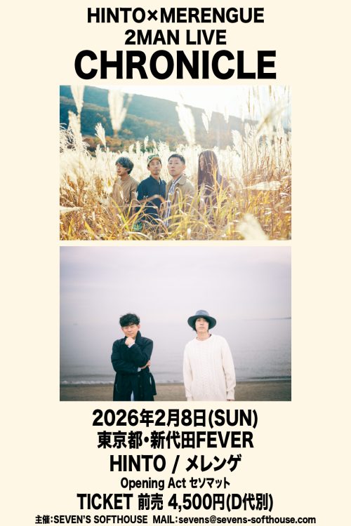 2/8(日)開催、HINTO × MERENGUE 2MAN LIVE「CHRONICLE」に、O.Aとしてセソマットの出演が決定しました。
