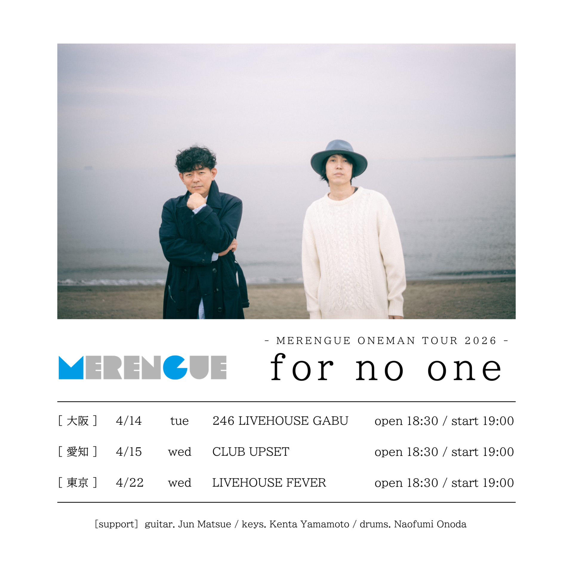 What's New 2026-01-16 NEW! 《LIVE - メレンゲ》2/8(日) 開催「CHRONICLE」にO.Aとしてセソマットの出演が決定! 2026-01-13 《LIVE - クボケンジ》2/13(金) クボケンジ×松本素生「Sou & Kubo's Fountain」開催決定! 2025-12-25 《LIVE - メレンゲ》東名阪ツアー2026「for no one」 開催決定! 2025-12-19 《LIVE - メレンゲ》26/2/8(日) HINTO × MERENGUE 2MAN LIVE「CHRONICLE」開催決定! 2025-12-19 《LIVE - クボケンジ》26/2/14(土) 「初恋の嵐 西山達郎生誕祭 ~初恋の嵐 カモンアゲイン!2026~ 大阪編」出演決定! Twitter Instagram Facebook